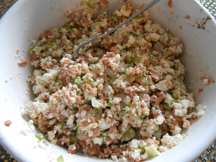 Place tofu, salt, chopped hot dogs and black pepper in large bowl. Using a table fork (not a spoon) lightly and loosely toss to mix.