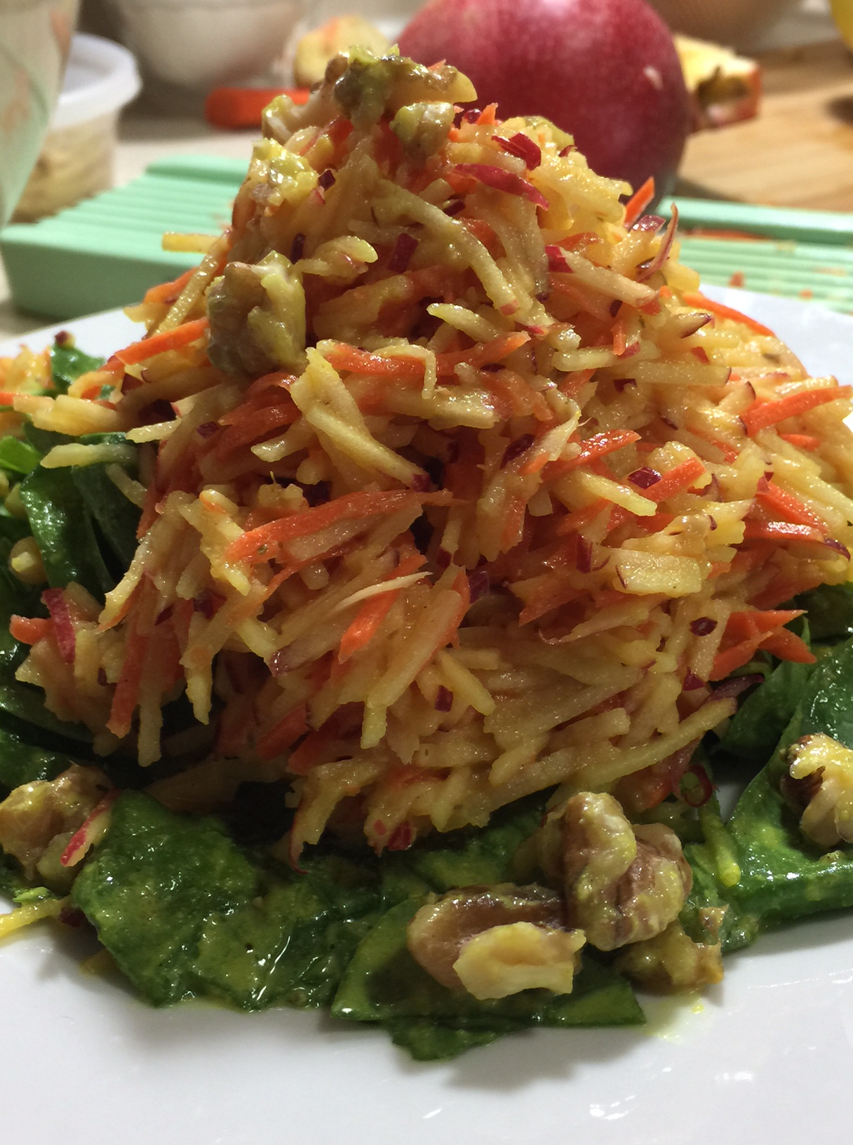 Some fresh ginger sticks, a few walnuts, some fresh spinach and a fat-free dressing created a nice lunch combined with the apple and carrot cut into tiny julienne style pieces. Fresh, succulent plus an attractive presentation! The addition of the walnuts makes this lunch salad mostly fat-free!