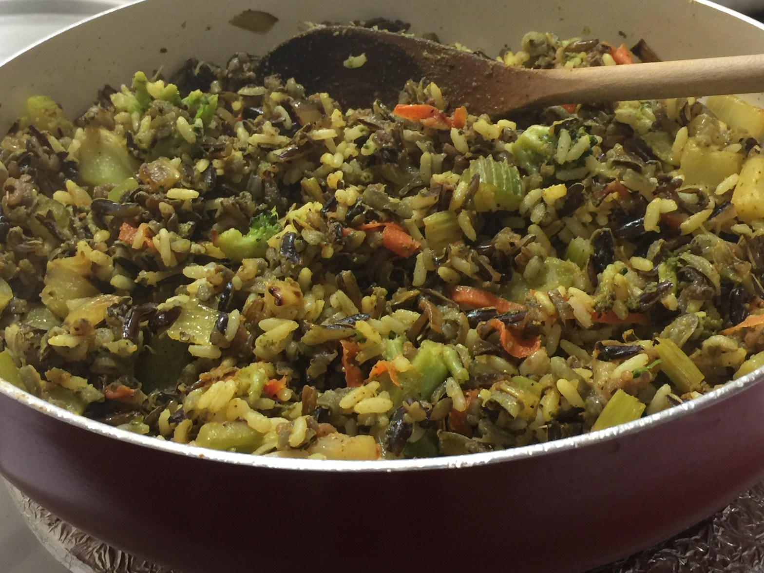 Add wild and white cooked rices. Stir well to distribute throughout the veggies evenly.