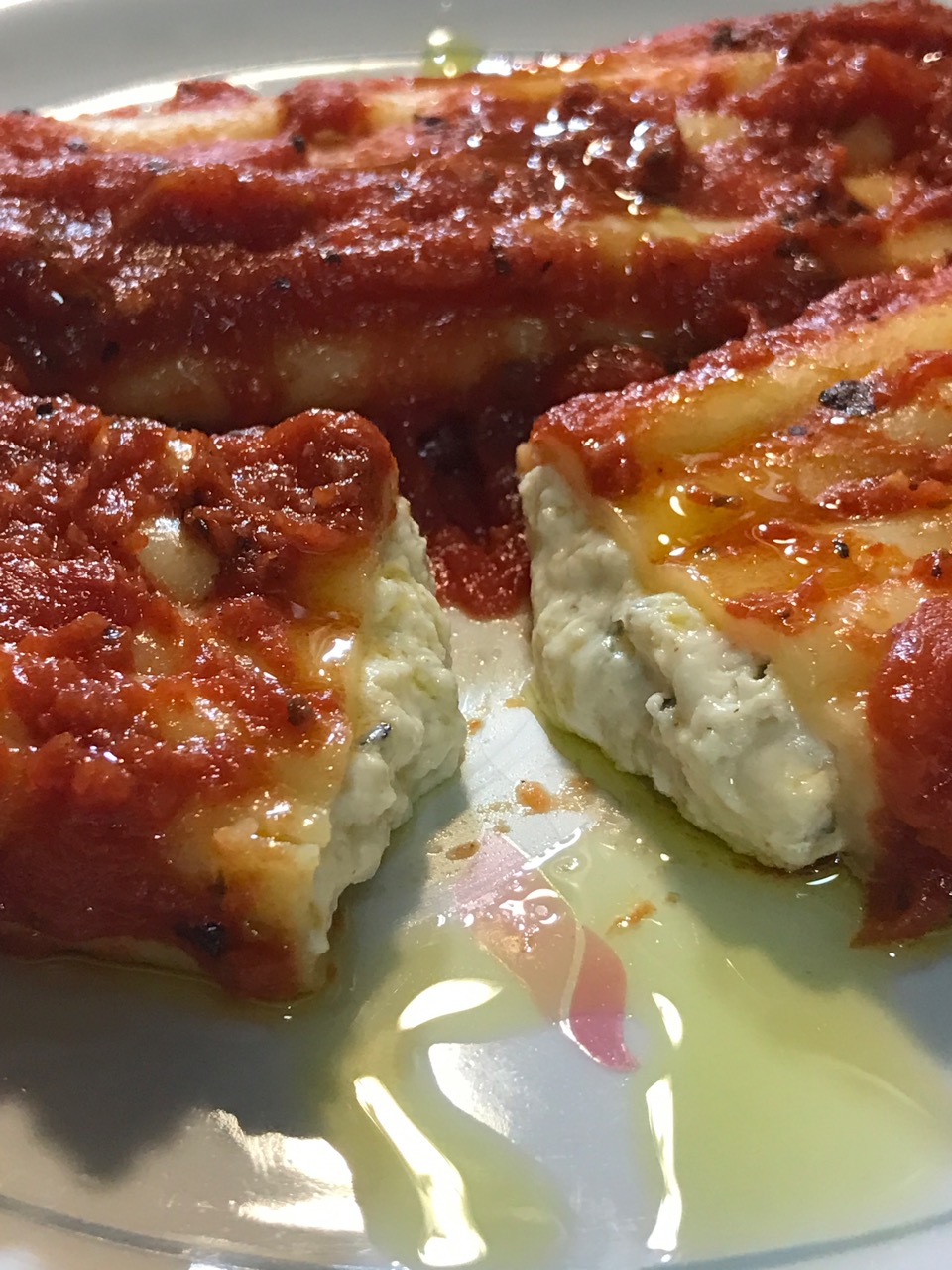 In the past, I made my own homemade pasta sheets, so didn’t have to struggle with stuffing these tubes. It’s not that easy, so I slit each manicotti tube up the side, opened them up flat, placed the stuffing elongated across the middle, then closed the tubes, overlapping the edges just a bit, then placed them seam side down in the baking dish on top of the marinara sauce.