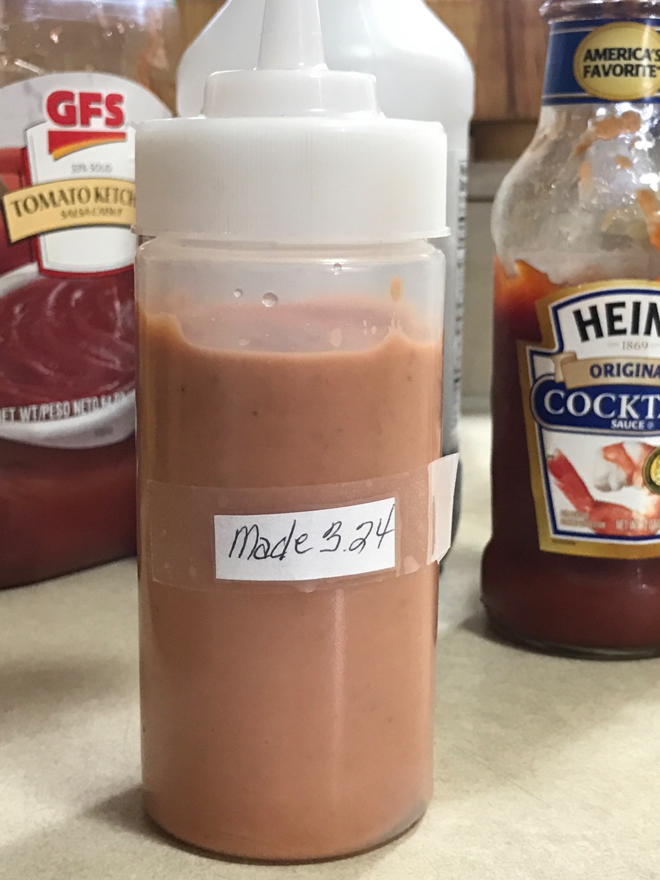 The mixture of 1/3 cocktail sauce and 1/3 ketchup mixed with 1/3 veg mayonnaise fits my needs and wants perfectly. You can use all ketchup if you want, or flavor it up a little more with Worcestershire sauce and/or steak sauce. Experiment.
