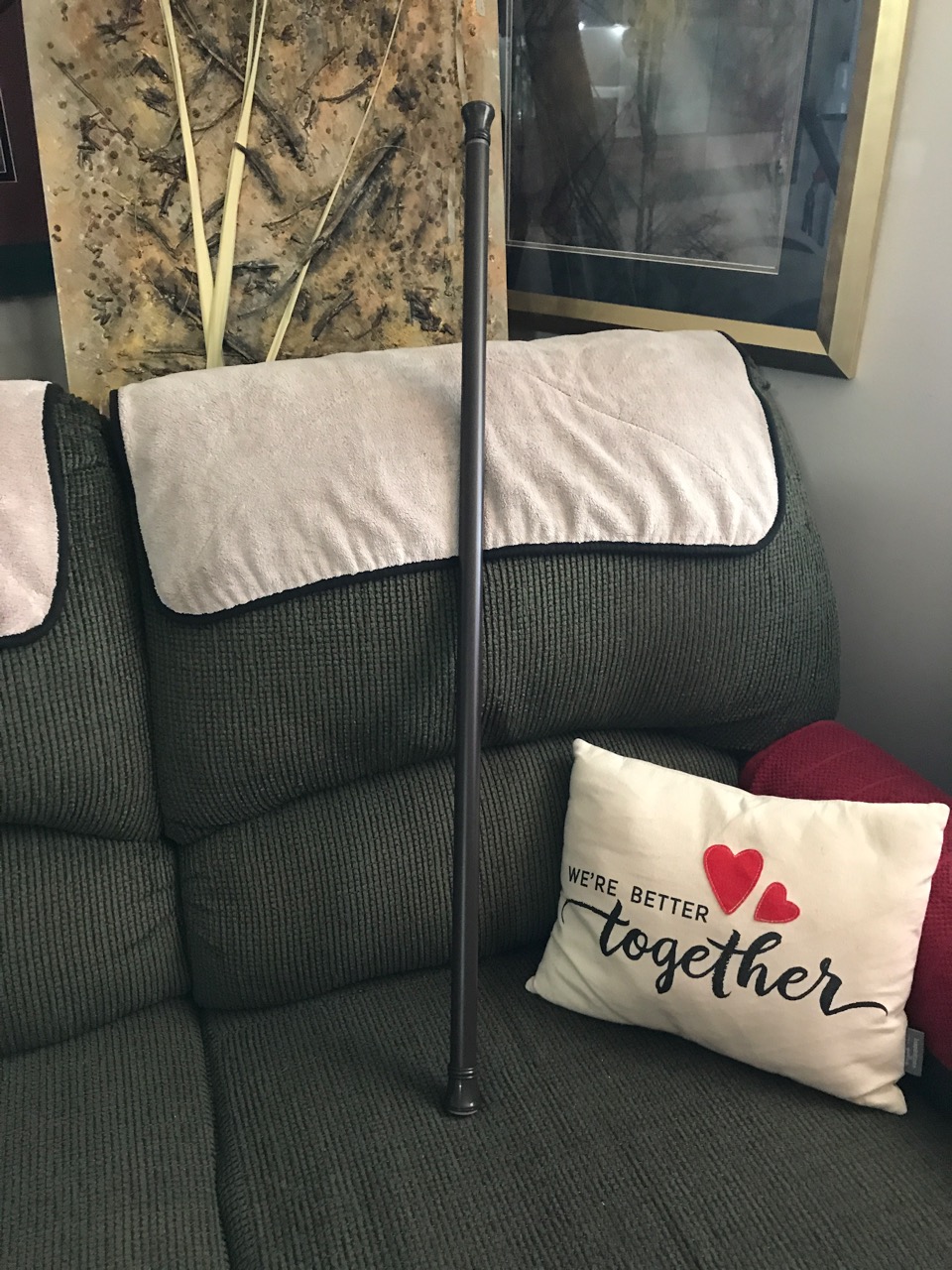 A 3 feet 3 inch long tension curtain rod, fully closed, I use for my exercise bar. Small circumference. You can buy longer or thicker; this suits me.