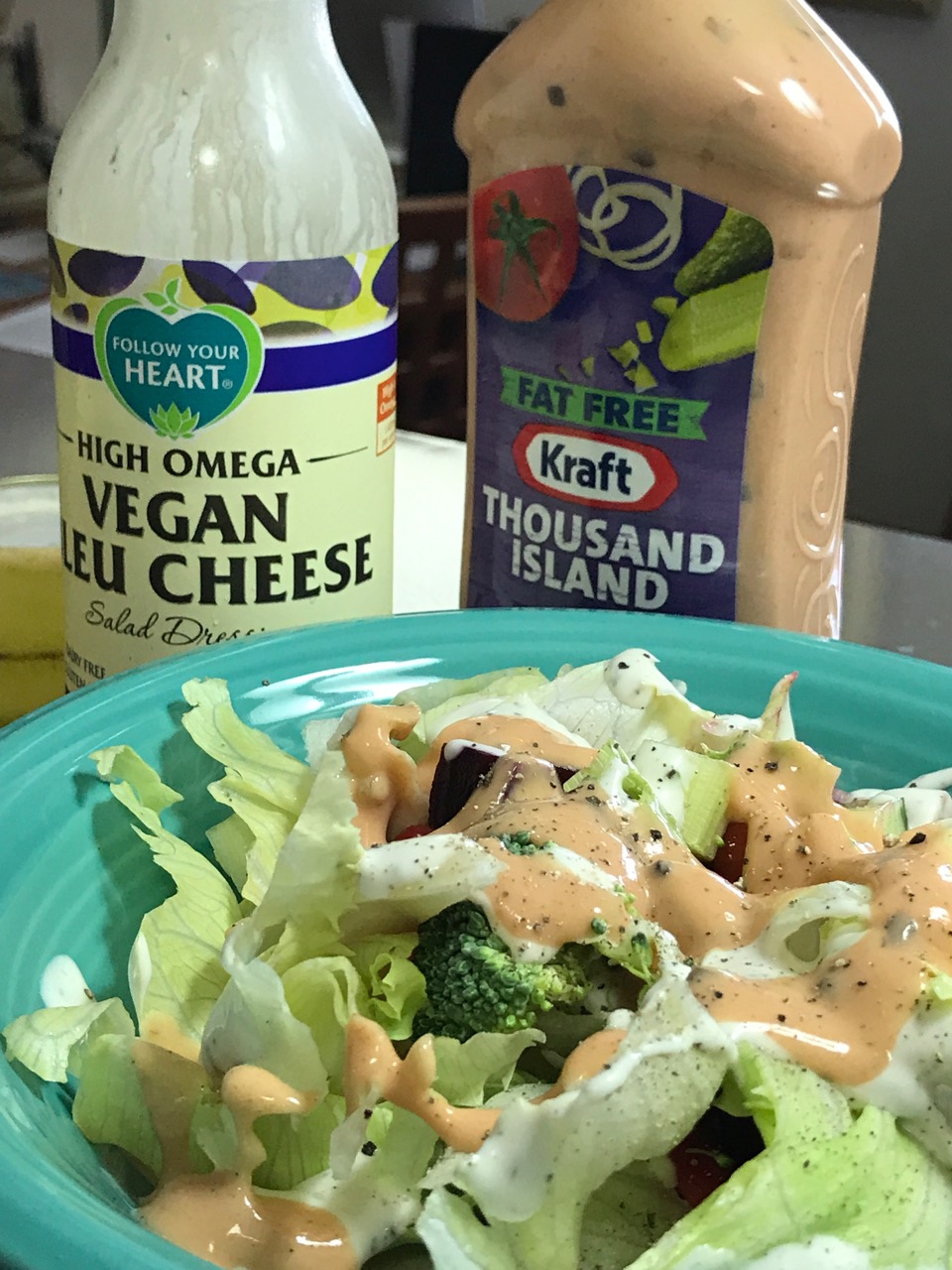 What I do is drizzle half of one or the other onto my green salad, then add a fat-free creamy dressing – Kraft Fat Free Thousand Island works well here. I reduce cost and fat.