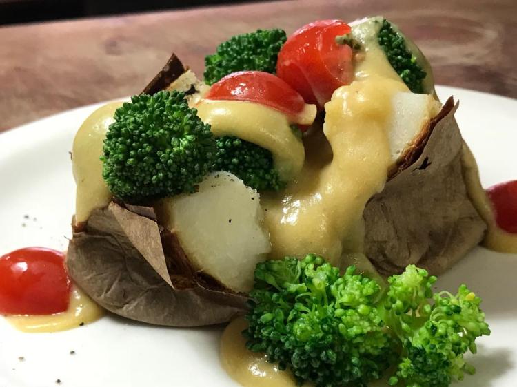 Bake some potatoes. Slit the tops open exposing the cooked potato, then top with fresh steamed broccoli buds plus fresh grape tomato halves. Spoon Pink Lentil Cream over all. Perfect fat-free dish.