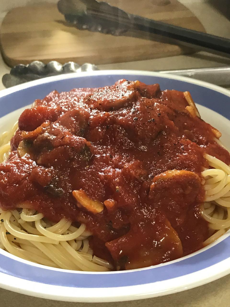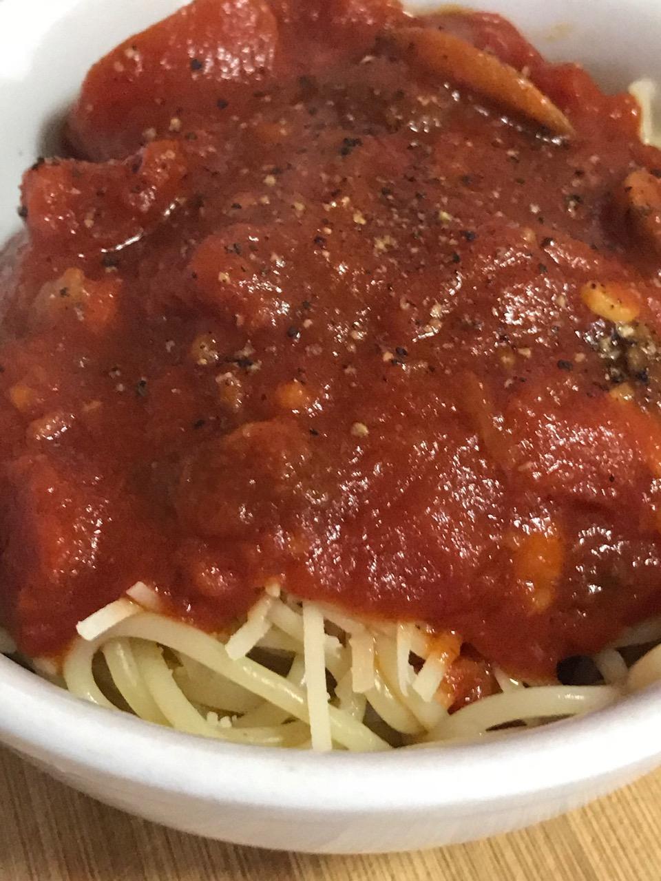 Salt and pepper to taste, then serve over cooked pasta of your choosing. We went the spaghetti route and savored ever forkful!