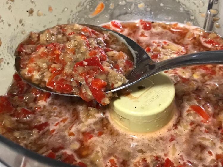 Place mushrooms with can liquid and roasted peppers with jar liquid in food processor. Process till evenly mealy, but not mush. Transfer to the same saucepan.