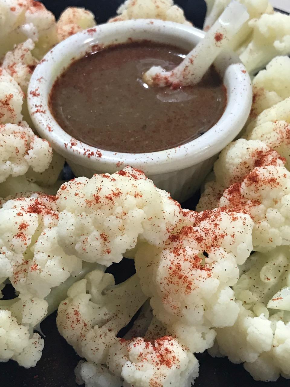 For each serving place 1/4 cup sauce in souffle cup and surround on plate with steamed cauliflower buds – I use about 2 cups for a meal for me.