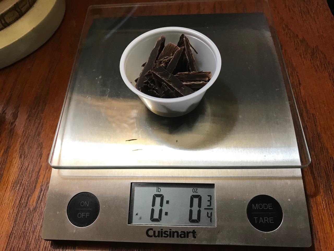 3/4 oz. semi-sweet dark chocolate – Cal. 102, Fat 1.2g
