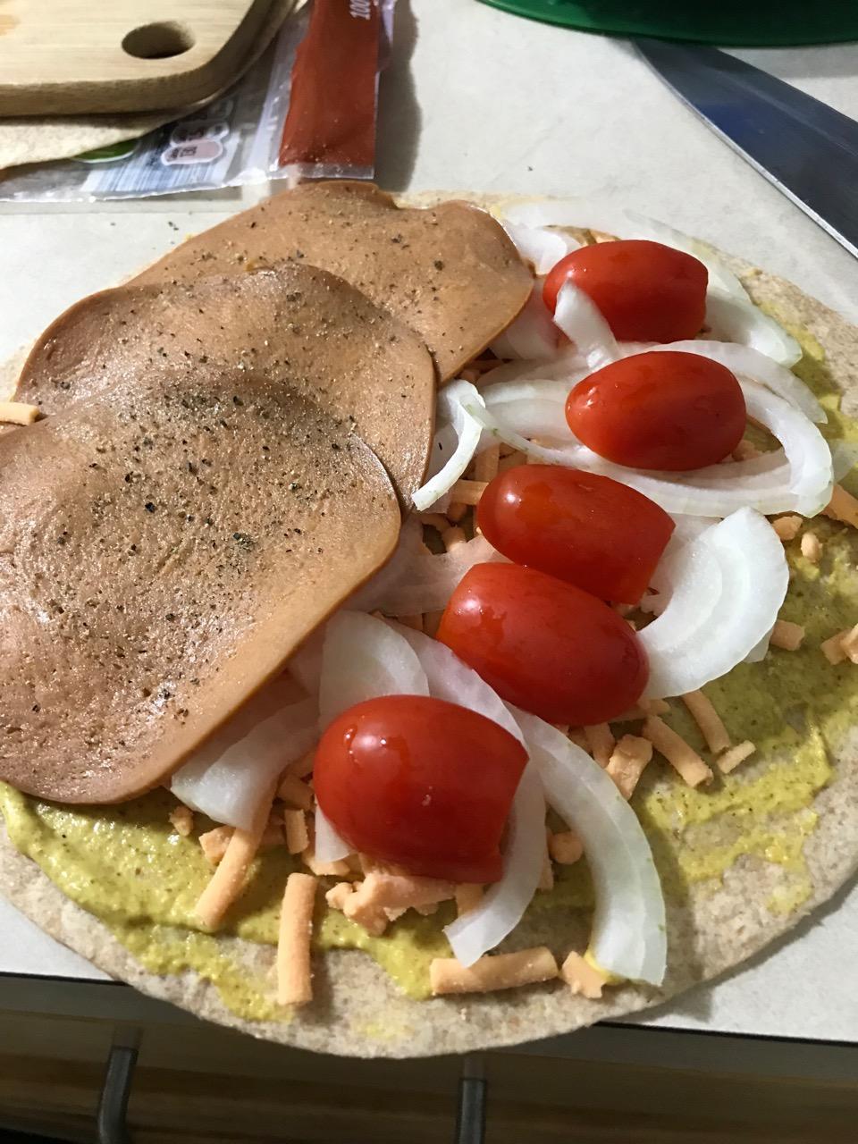 Spread a whole wheat tortilla evenly with mustard. Top evenly with 1 oz. shredded vegan cheddar cheese. Place tomato and onion on one half, and 3 veggie bologna slices on the other. Sprinkle with fresh grind black pepper. Carefully fold over in half, pressing lightly.