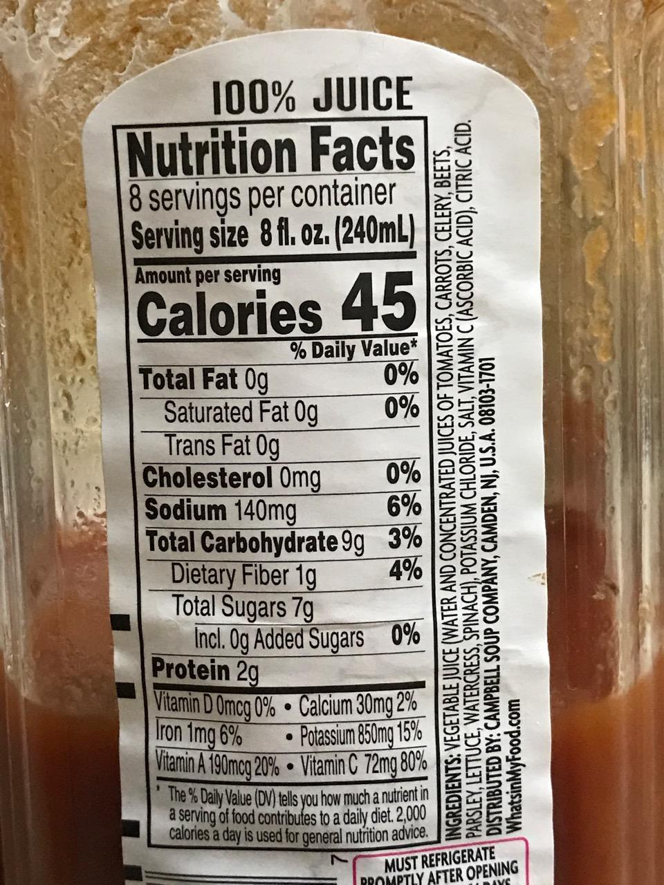 6 oz. V-8 Vegetable Juice – Cal. 34, Fat 0g