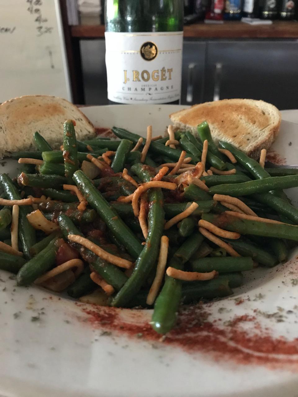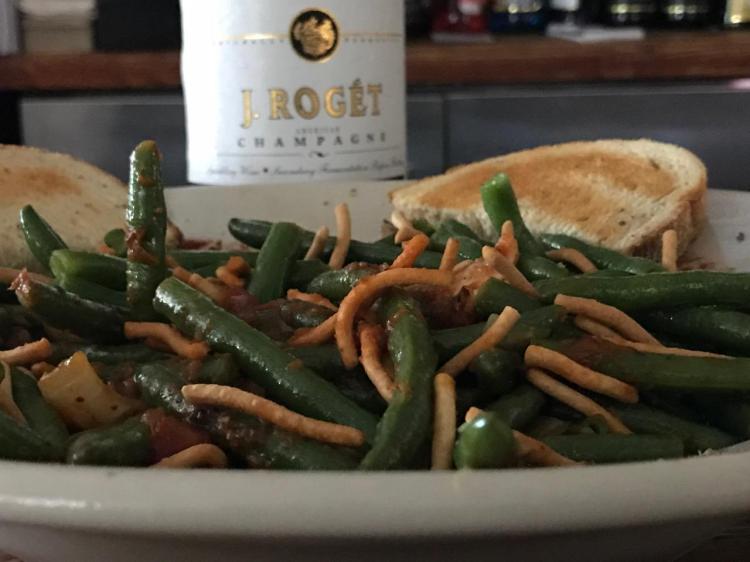 TICK TOCK green beans w/mushroom, onion and tomato and Chow Mein noodles – Cal. 279, Fat 15g