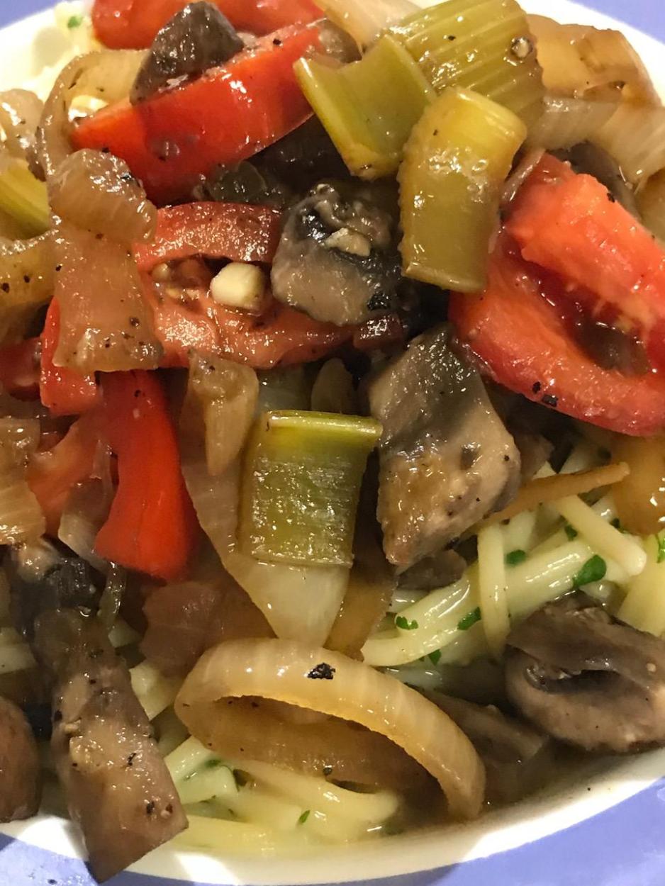 The next night I reheated the spaghetti in a large skillet with some water to thin it, then cooked to evaporate some of the water while plumping the spaghetti. I then added the leftover vegetables to the skillet and mixed them in. Additional salt, pepper and garlic powder to taste was all it took to make a superior tasting and feeling pasta bowl with mushroom and veggies. Out of sight delicious.