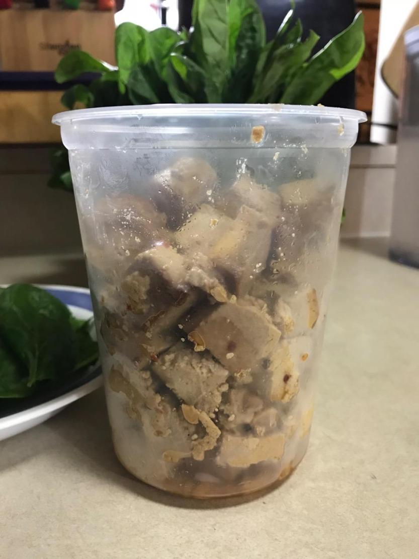 Roasted Tofu Chunks from Lucky’s Market. Lower calorie and fat plus better tasting than deep-fried. Great to add to a salad or to snack on when you get that urge to chew.