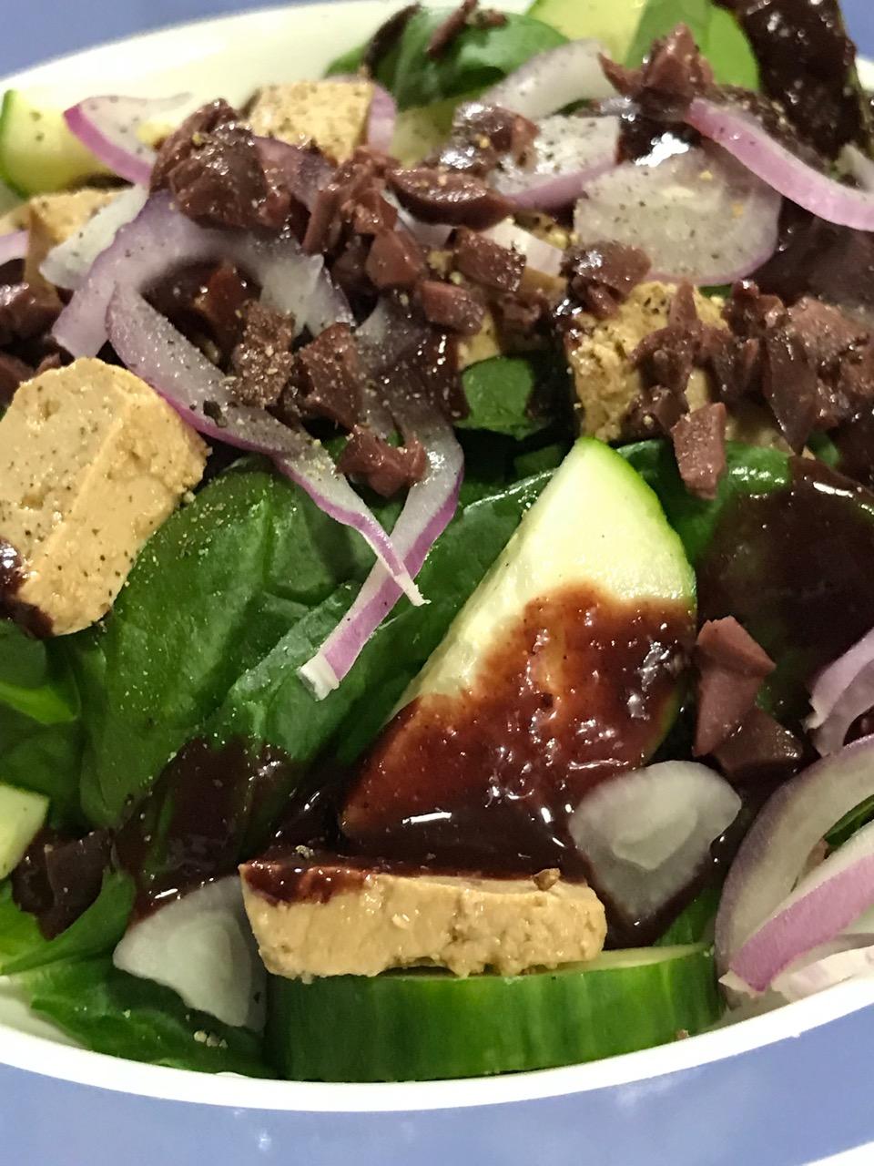 fresh spinach w/cucumber, 2 chopped Kalamata olives, red onion – Cal. 12.5, Fat 1g