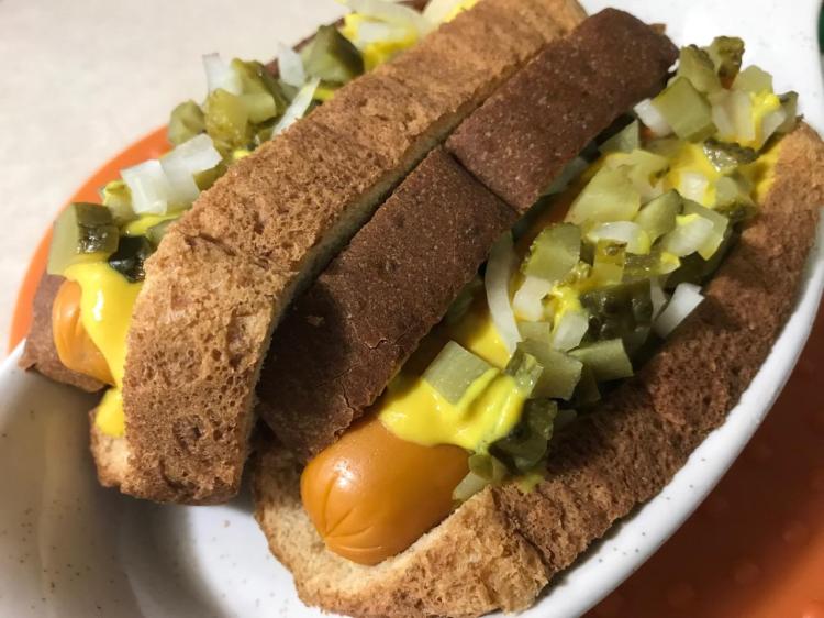 w/2 slices classic wheat bread, mustard, chopped onion and dill pickle chop – Cal. 140, Fat 2g