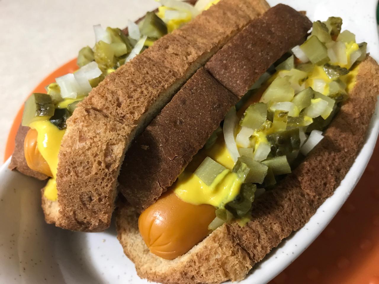 TOFU PUPS ON BREAD w:mustard onion dill pickle chop