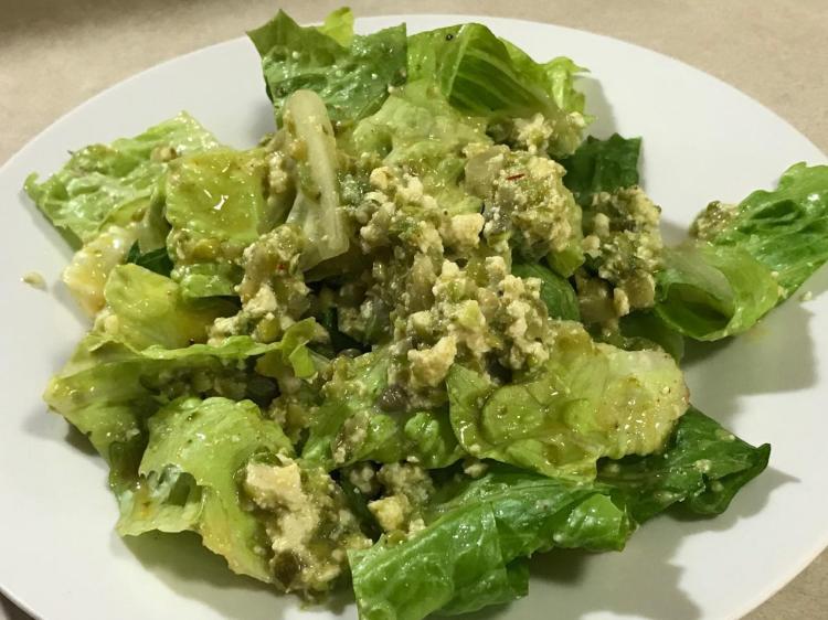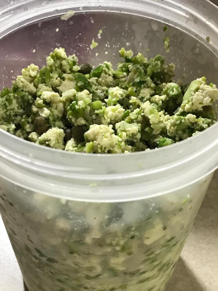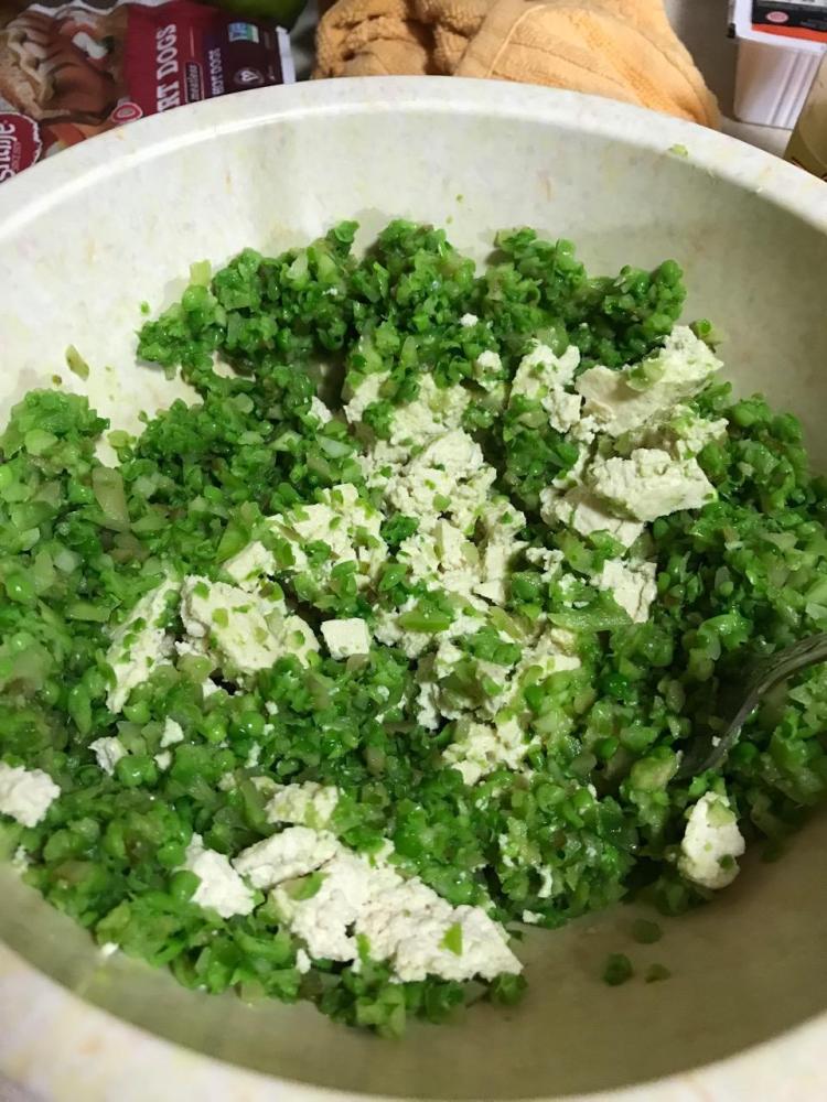 Now add green chop to tofu. Mix well, keeping the crumbles even in size. This is not a pate, so no mashing.