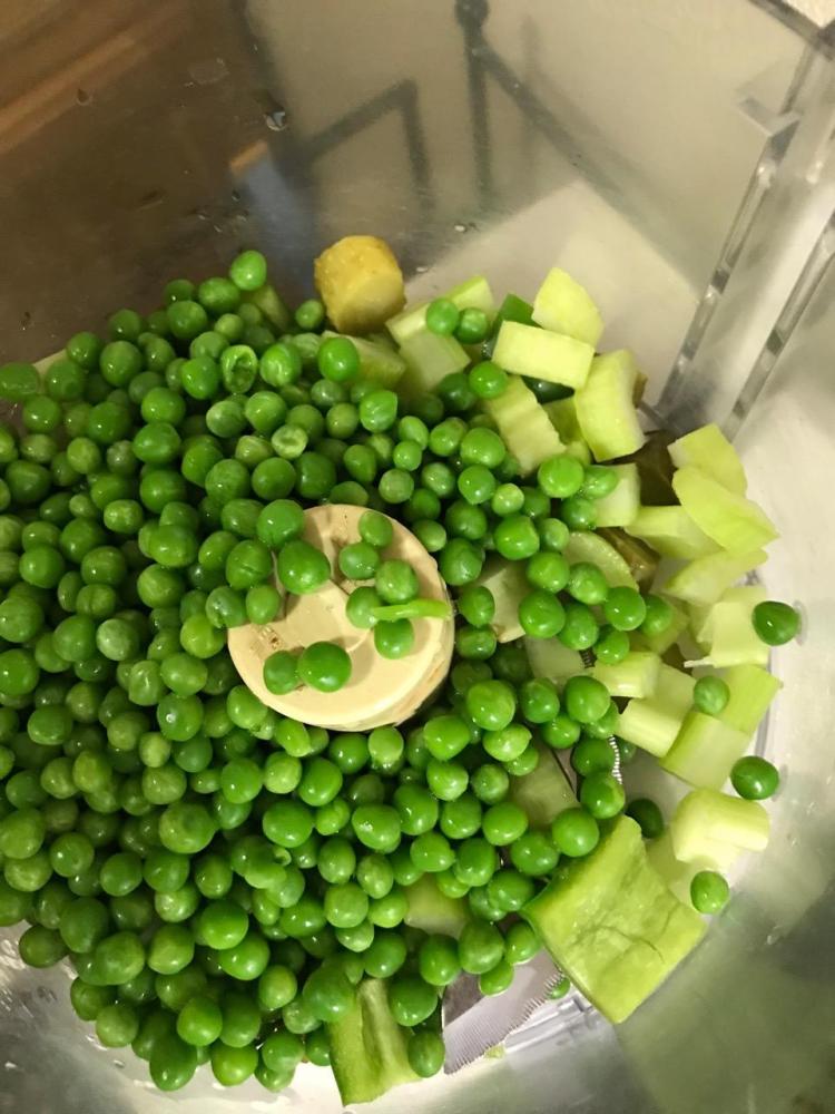 Place green pepper chunks, dill gherkins, celery and thawed peas in food processor and pulse, then using spatula scrap insides down and up from bottom, then pulse again till evenly chopped. No mush allowed! Set aside.