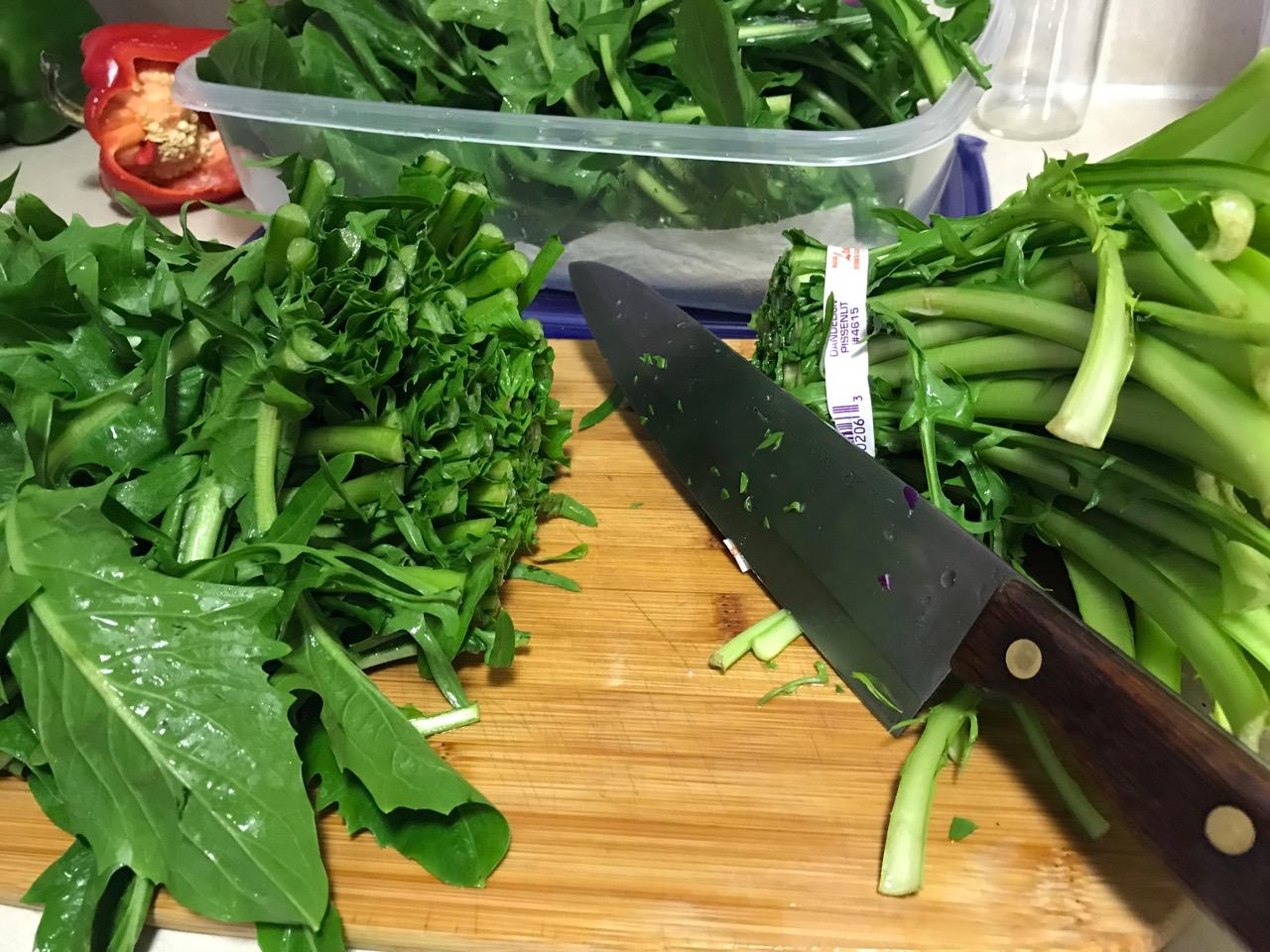 They didn’t look like the ones I bought from Lucky’s Market. Lucky’s cuts the tops and bottoms off all their greens, but then the cost is through the roof. I’d rather prep my own. By taking the tops off, they take too many good leaves with it.