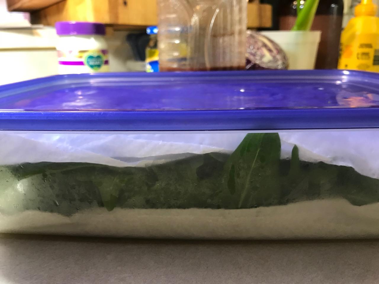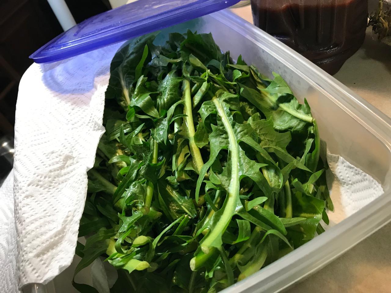 Notes: You may be tempted to towel dry these greens to speed the process. Don’t. You may end up wringing the leaves inadvertently and that will destroy the crispness that we’re aiming for as they dry naturally.