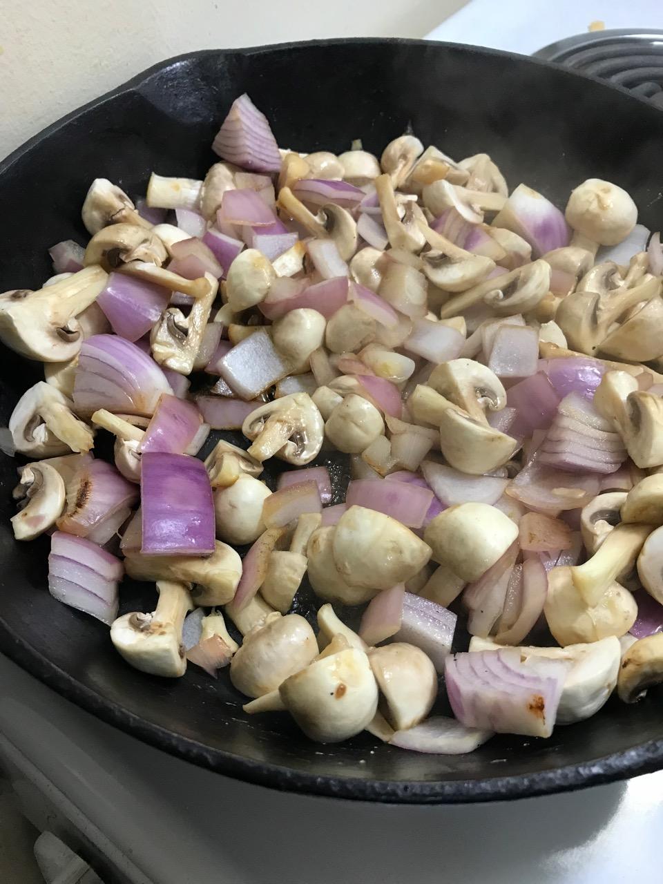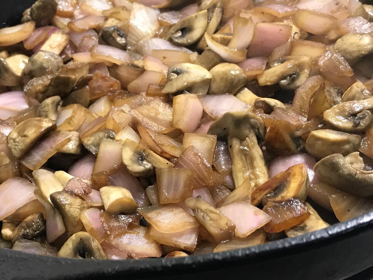 Notes: When sauteeing the onion and mushroom in a dry skillet, you don’t need to add any saute liquid, since the liquid from the fresh mushrooms will provide enough to see these mushrooms through to where we want them to be – tender.