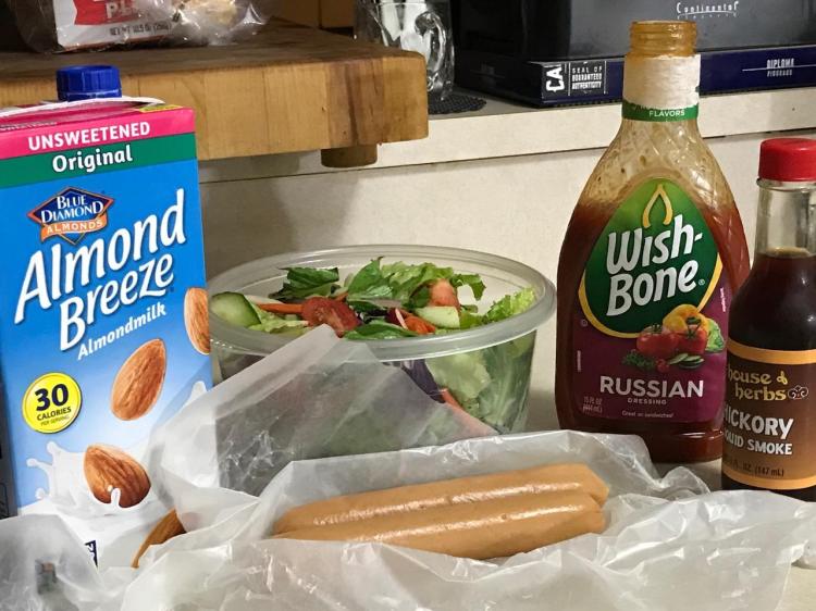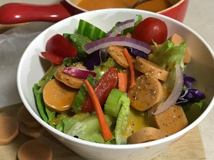 To increase the protein content in one of the salads I used with this dressing, I sliced a chilled veggie hot dog and tossed with lettuce, tomato, onion, carrot cabbage and red pepper. Tasted great for lunch!