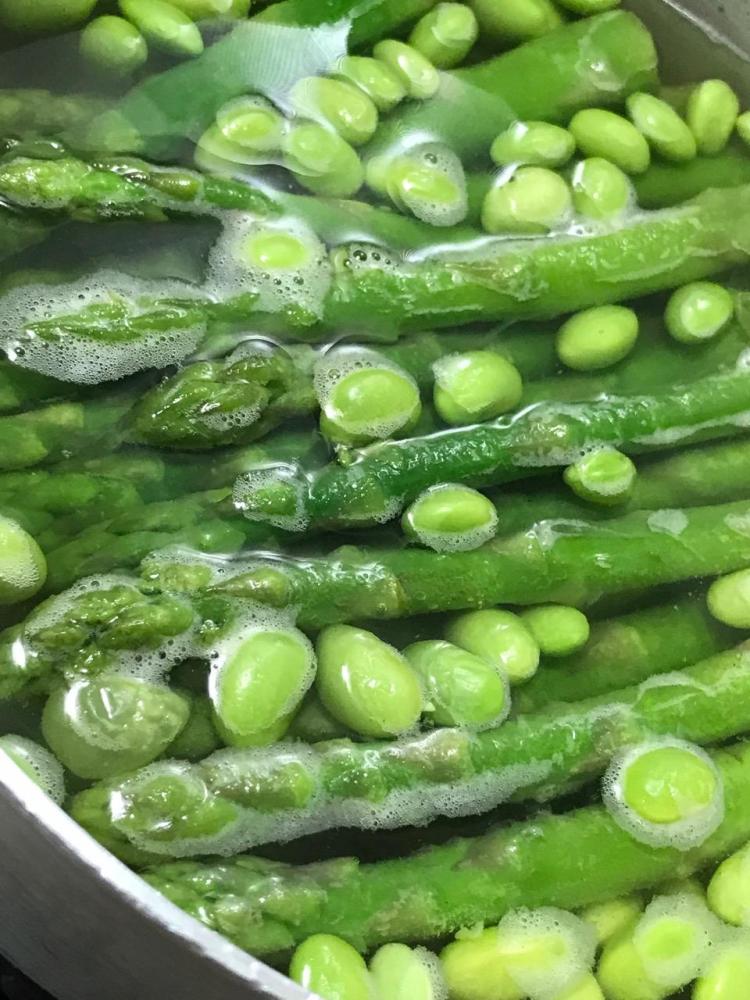 Combine veggies, water to cover and salt to taste in saucepan. Bring to boil to thaw, then drain. Separate edamame from asparagus. Line asparagus up on board and cut off 1 inch from bottom; discard. Cut remaining spears into 1 inch lengths. Set aside to add to rice later.