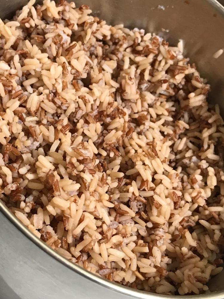 > Normally, I wouldn’t cook white rice 30 minutes: 15 or 20 minutes depending on the style rice and how firm I want it. Here, when mixed with red rice, it works. The softer white rice, when cooked as long as the red rice in the same pan, doesn’t make the white rice as soft as it would be if cooked separately. I like it.