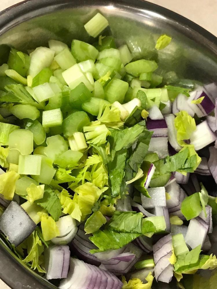 In extra-large skillet, over medium heat, melt 2 T. olive oil. Add red onion, celery and salt. Saute till tender.