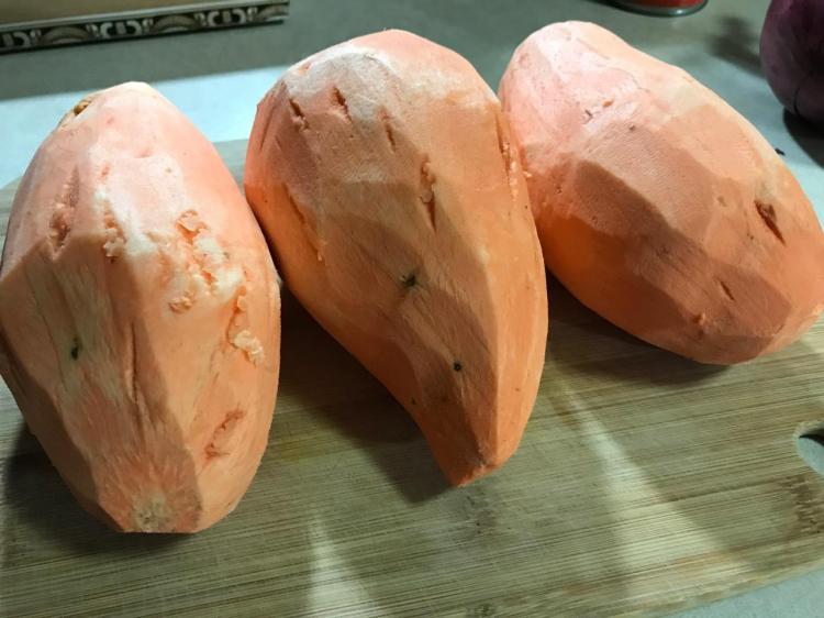 4 lbs. fresh yams – cut tips off, then slice into 1/2 inch thick rounds as best you can (no thicker, otherwise they won’t cook evenly throughout)
