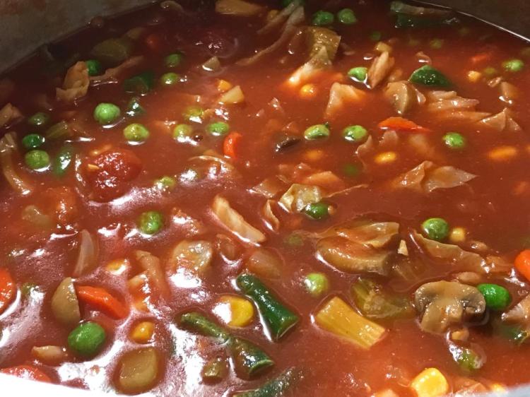 Add remaining ingredients, stirring after each addition. Keep at a slow boil, uncovered, for about 20 minutes or till veggies are done to your liking.