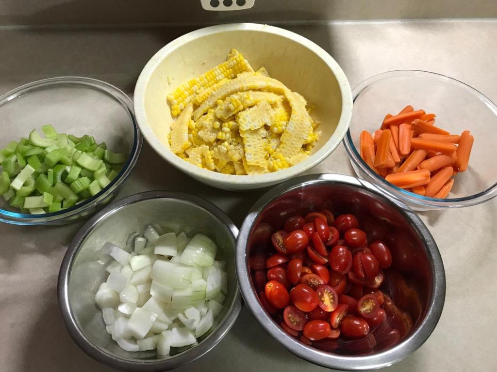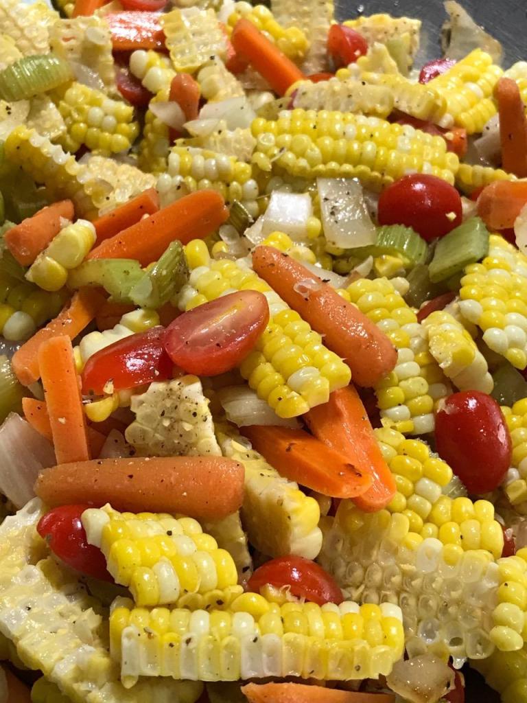 In extra-large bowl combine corn, carrots, tomatoes and celery/onion saute. Toss to evenly distribute. Salt and pepper to taste.