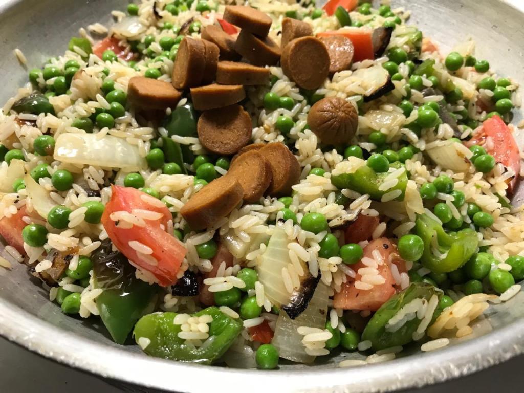 Add rice all at once, top with tomato, peas and hot dog slices. Stir well to coat all grains with oil.
