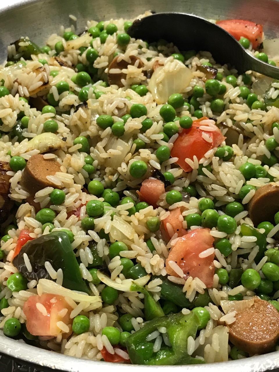 Add rice all at once, top with tomato, peas and hot dog slices. Stir well to coat all grains with oil.