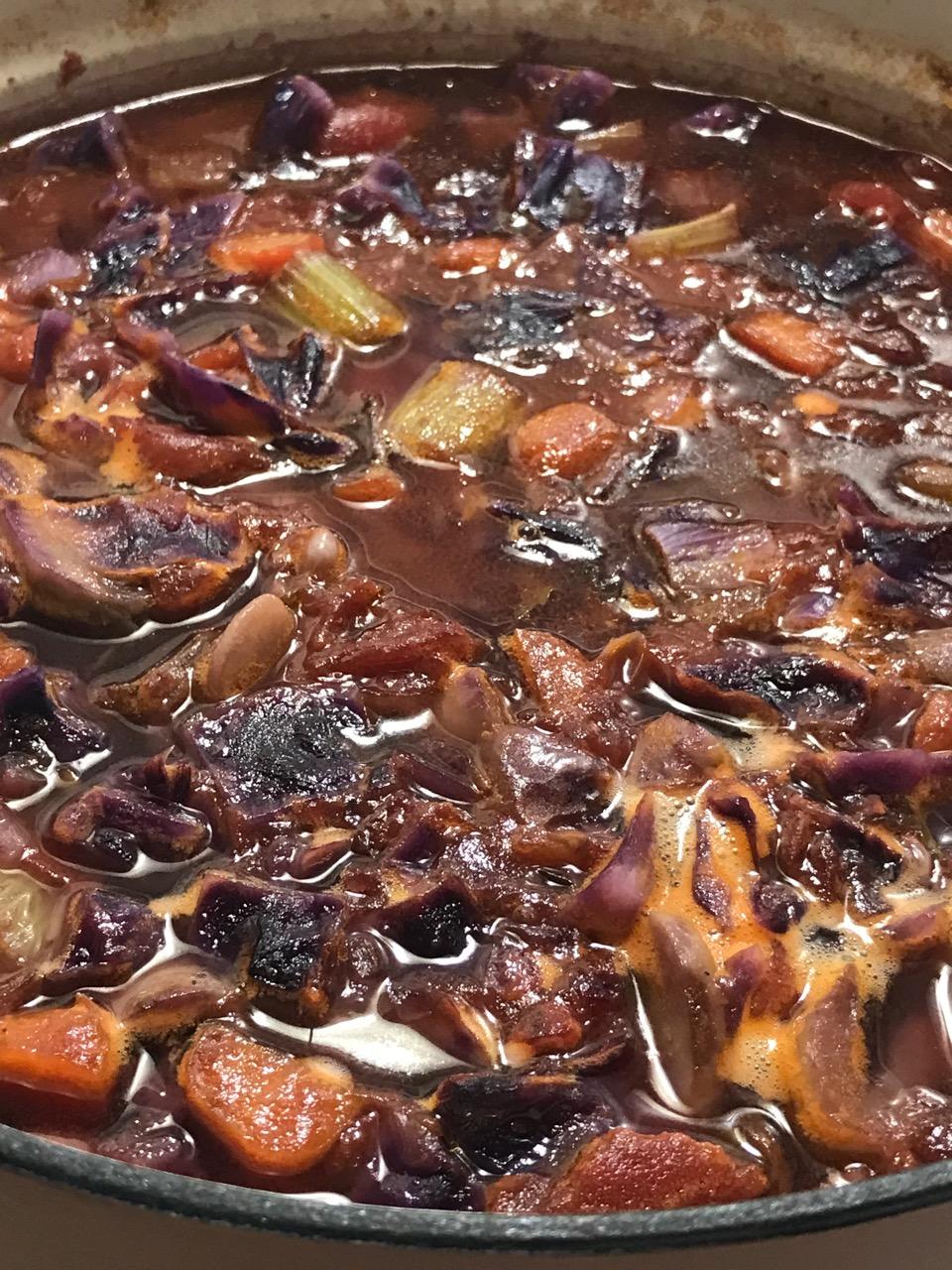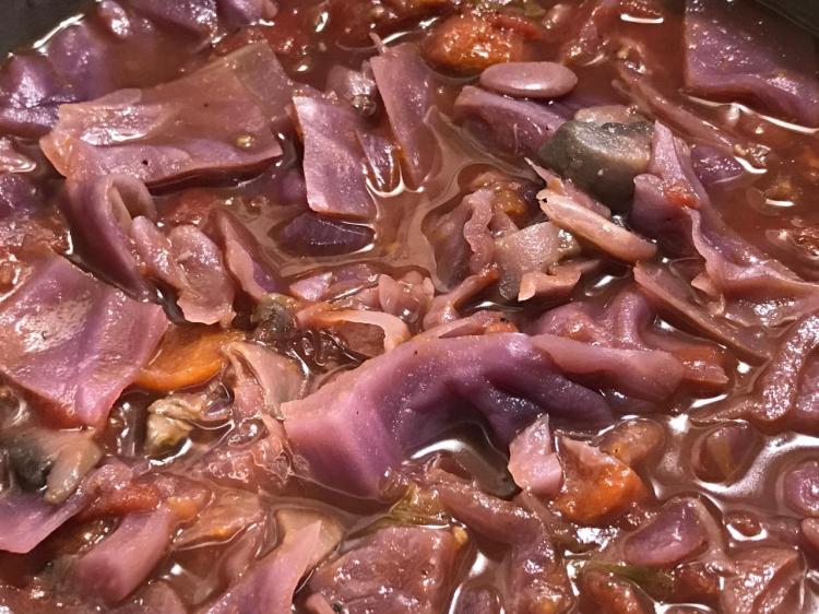 This stew serves best the day you make it – all the way around it’s better. By the next day the entire stew and everything in it turns purple grayish. The purple leaves the cabbage and colors all the other ingredients.