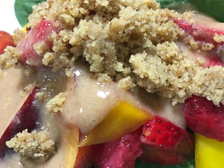 Easy, fresh, velvety smooth. Perfect dress for fresh fruit! Top with smoky brown sugar walnut crumbles takes the party to the roof top. A fresh spinach bed teams up well with the crumbles extending texture contrasts without cluttering it!