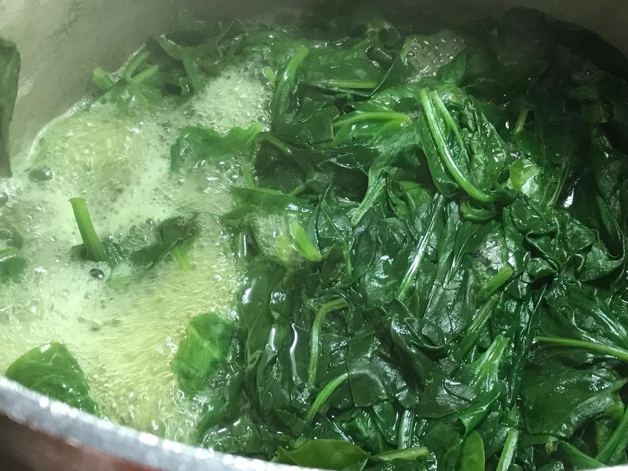 2 lbs. fresh spinach, washed, then boiled till tender but not mush, drained in colander; set aside