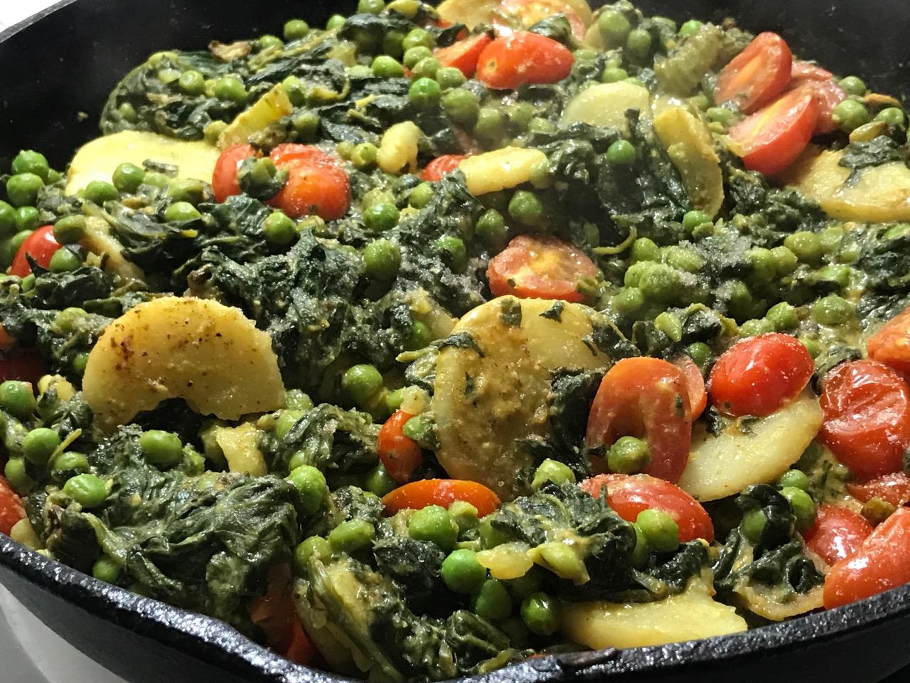 Easy to make, low fat skillet supper with lots of spinach, peas, celery with pan-fried potato slices, grape tomatoes in a simple garlic mustard glaze!
