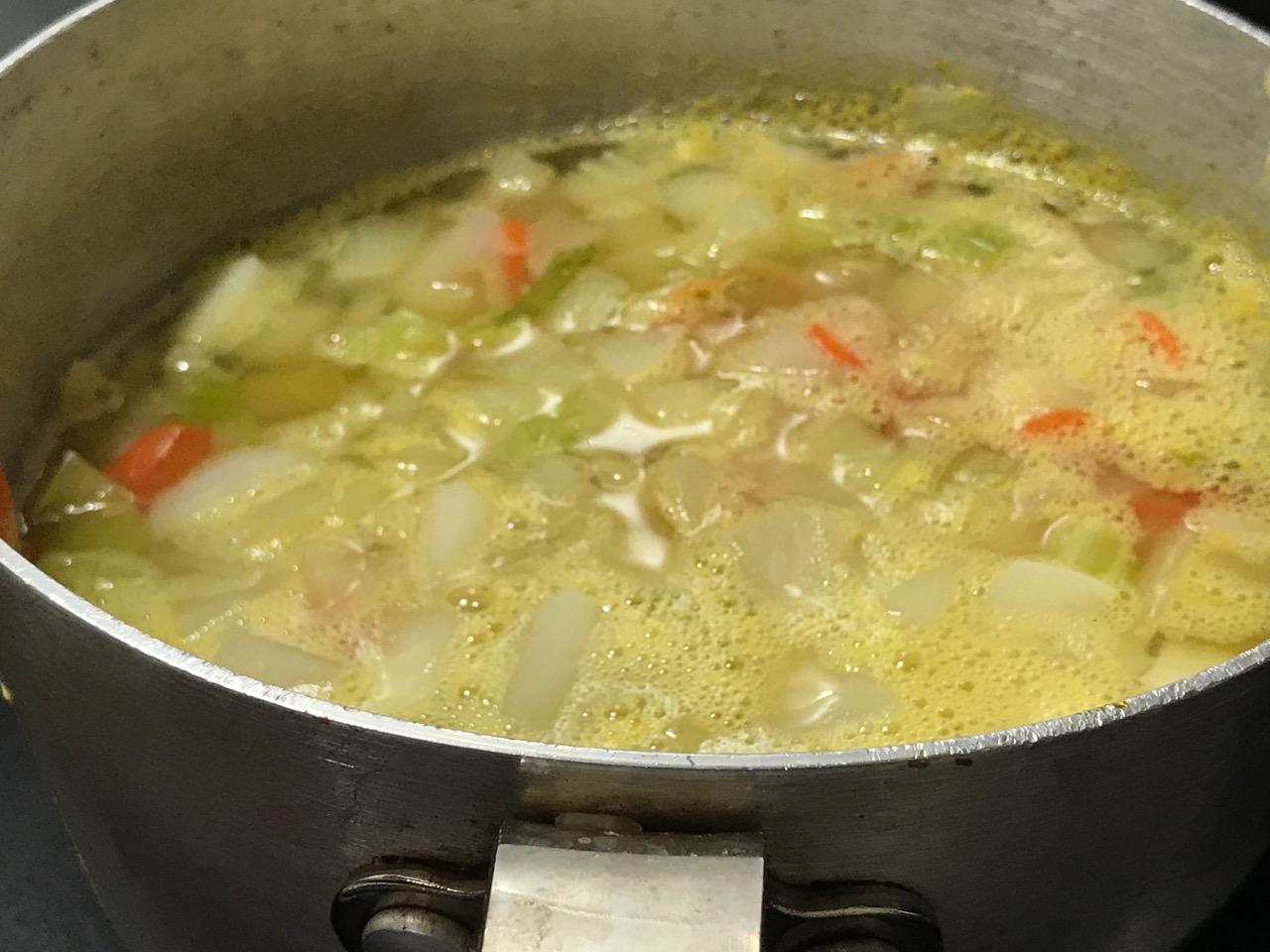 In separate large saucepan combine onion, celery, turnip, carrot, pea water and salt.