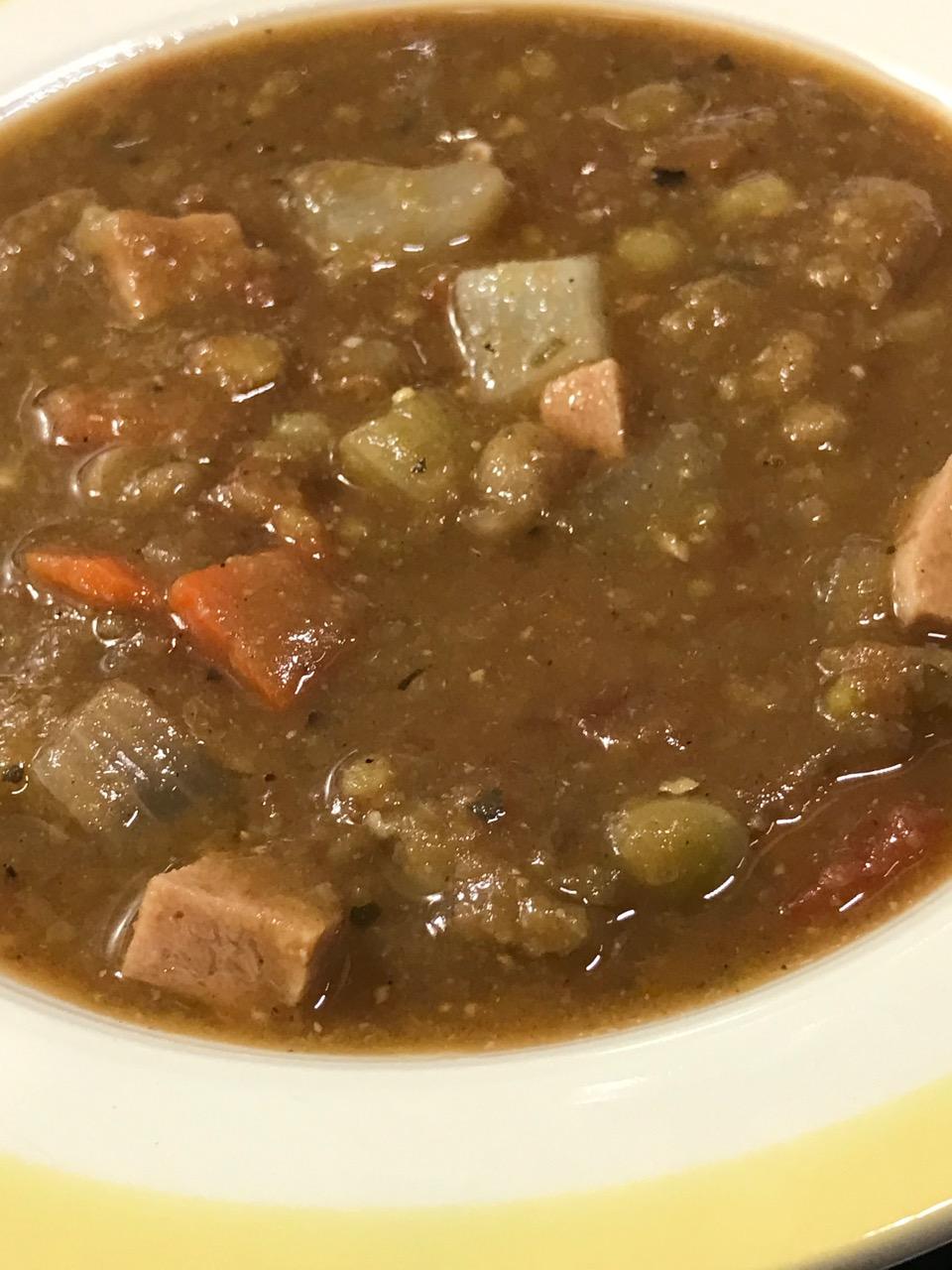You may want to puree a portion of the final soup product to make a creamed or pureed version of the soup. Yes, the ham and all. Nice effect.