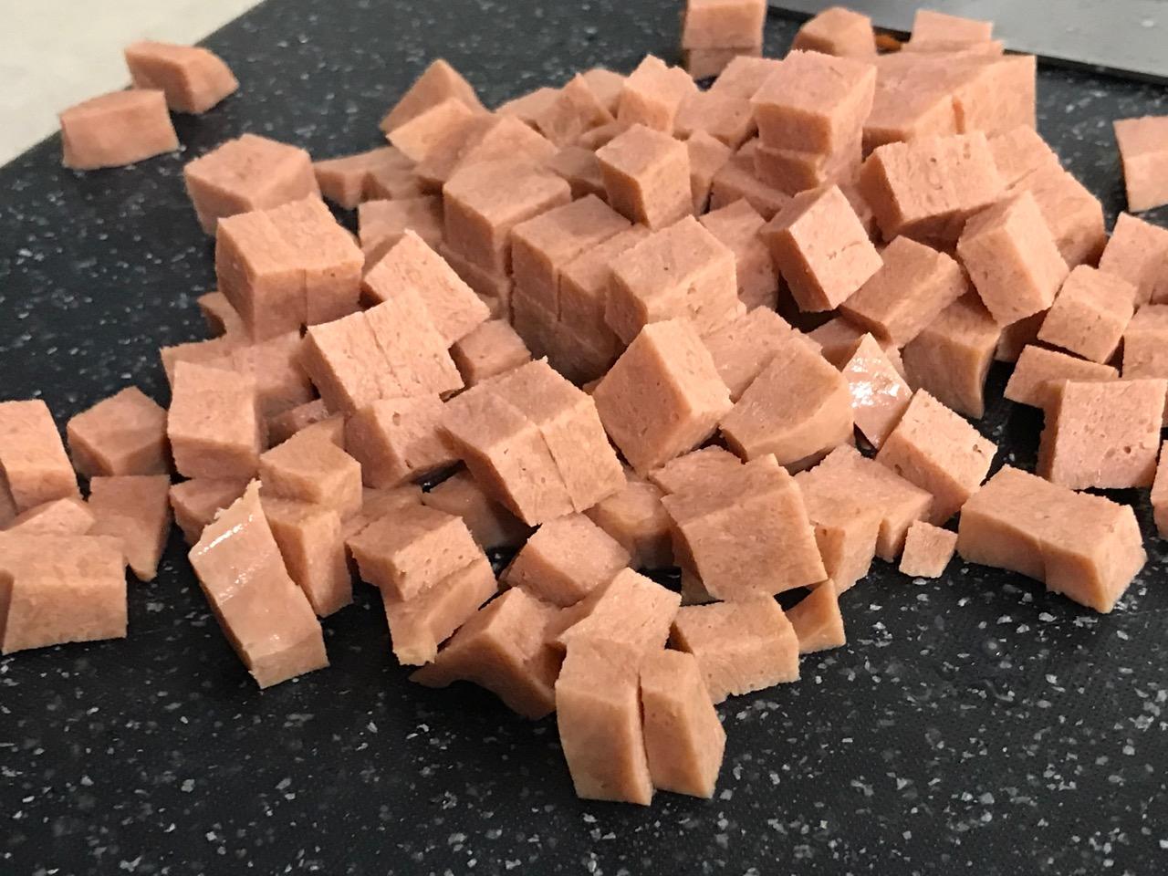 1/2 lb. animal-free ham, cut into 3/8 inch cubes – I used May Wah IMITATION HAM – great product