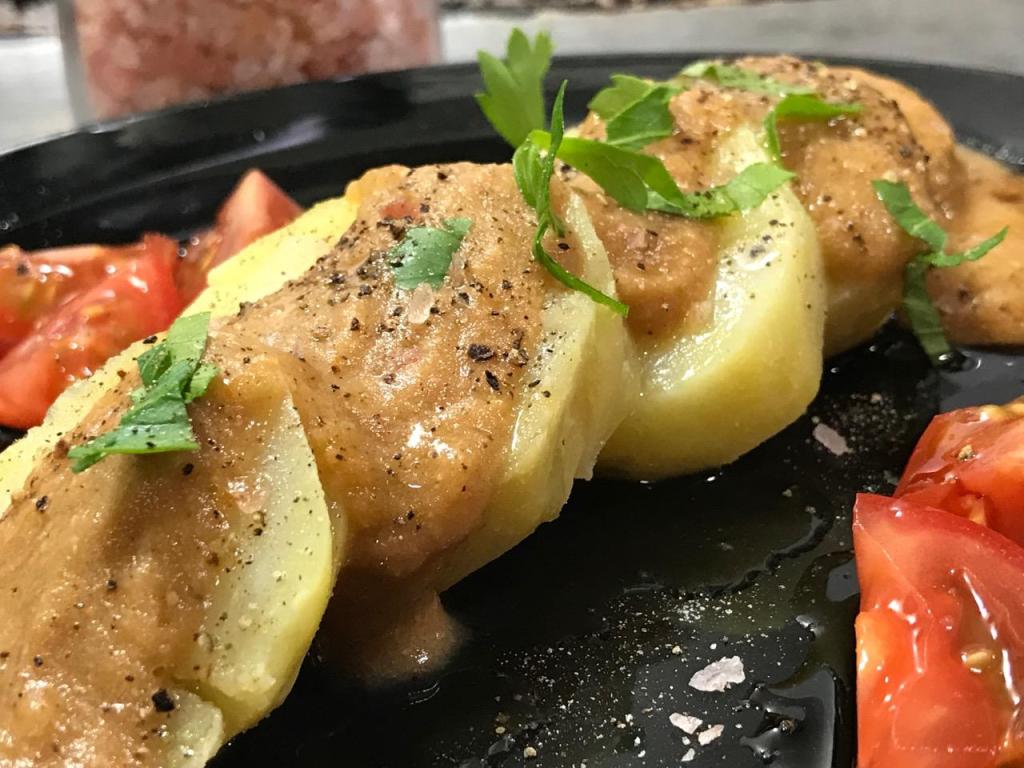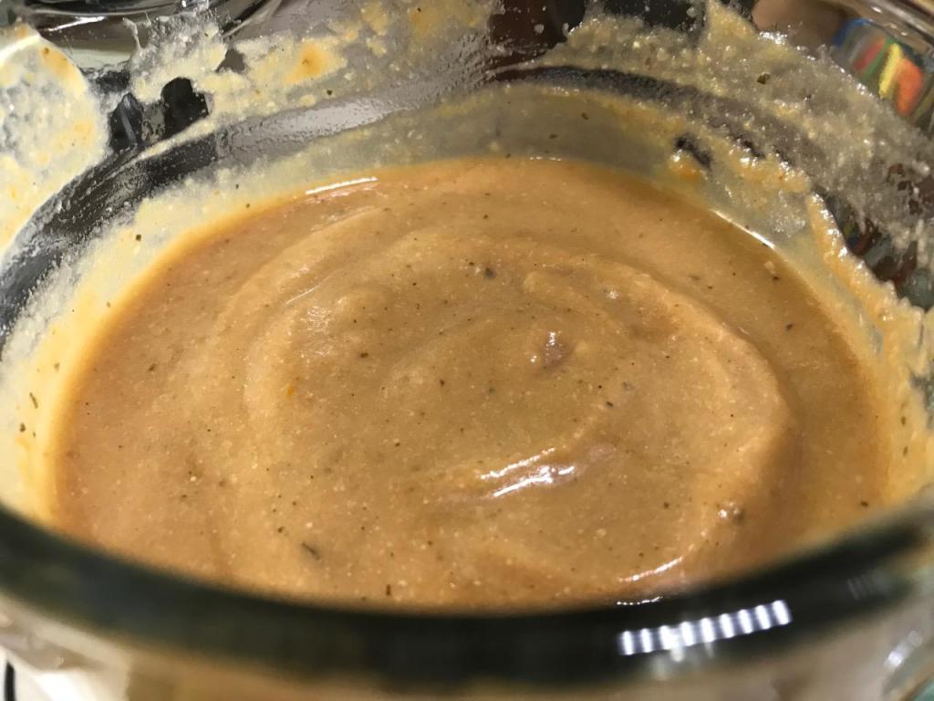 Make a gravy by using some of the puree, adding some oil – I used extra virgin olive oil – and serve over mashed or sliced boiled or baked potato. Makes for an enticing and satisfying small plate at any restaurant at low cost and prep time. Adjust seasonings to your liking.