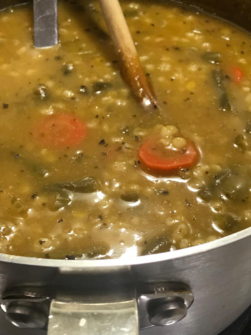 Continue to cook at a soft boil till barley and veggies are tender.