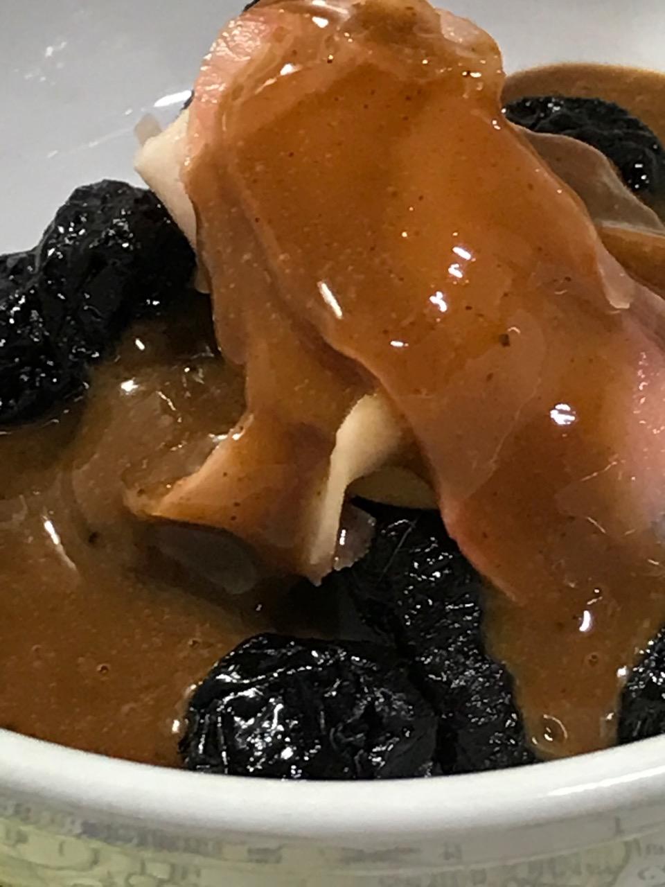 Or, make a fat-free dessert of tender prunes topped with sushi ginger and a little liquid from the ginger, then drizzle with SWEET COFFEE MUSTARD DRESSING.