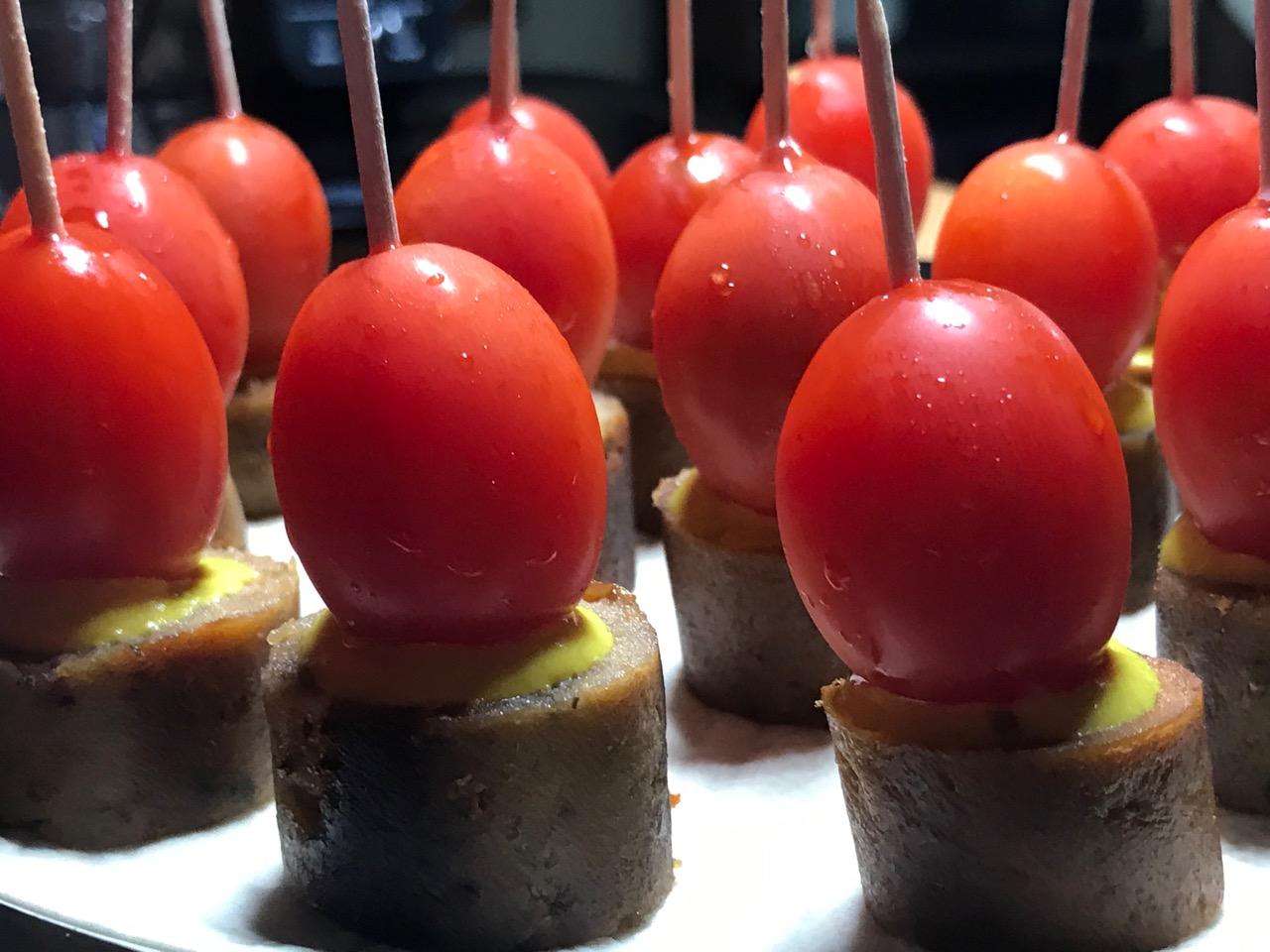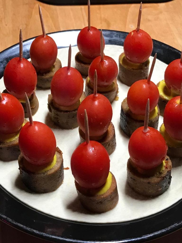 A super easy and low calorie Hors’ Oeuvre that will please every palate! Pan-fried sausage and frankfurters – cut into 3/4 inch wide disks, top each with a dab of mustard, then spear each with a grape tomato! That’s it – delicious and juicy too!
