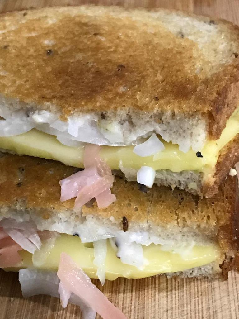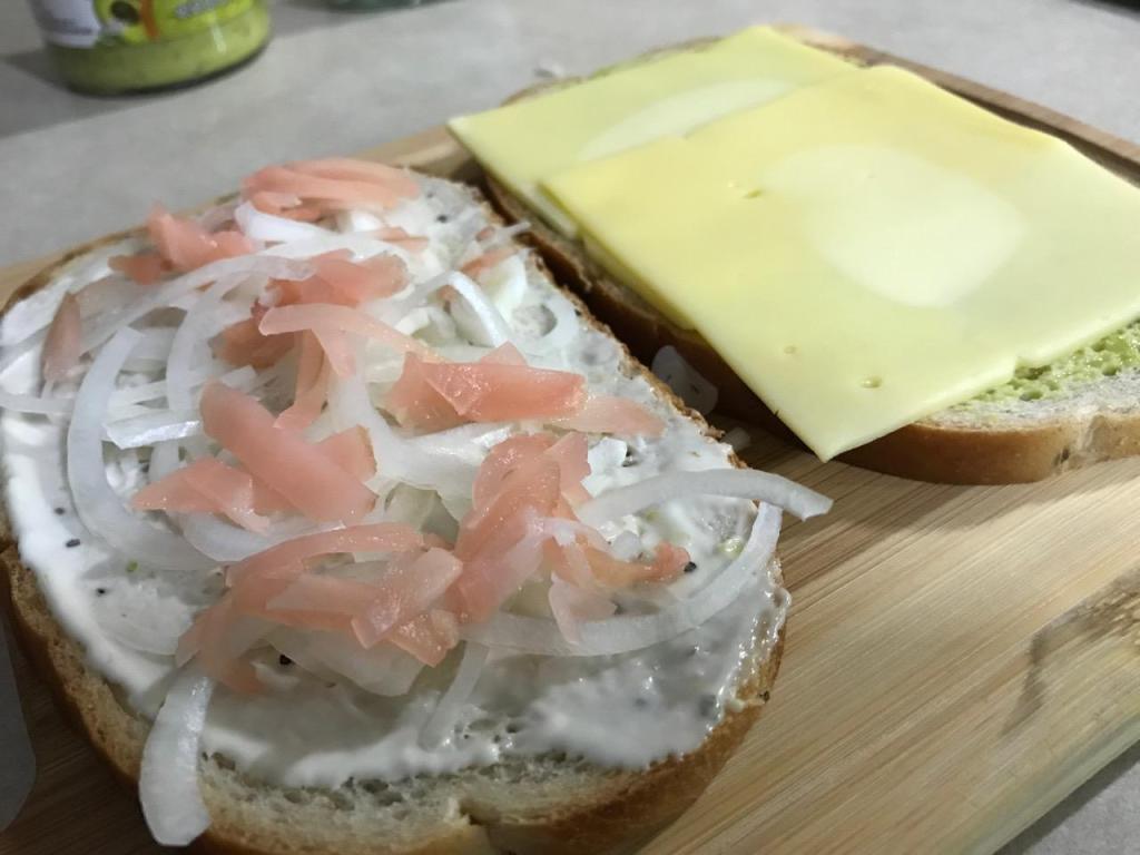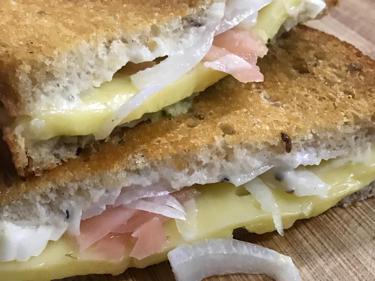 Out of the box grilled cheese sandwich. Rye bread, guacamole salsa, creamy Caesar dressing, smoked Gouda plant-cheese, sweet onion and pickled sushi ginger, all grilled in a light sesame seed oil! Wow, I was in grilled cheese heaven after coming off from a 16 hour fast!