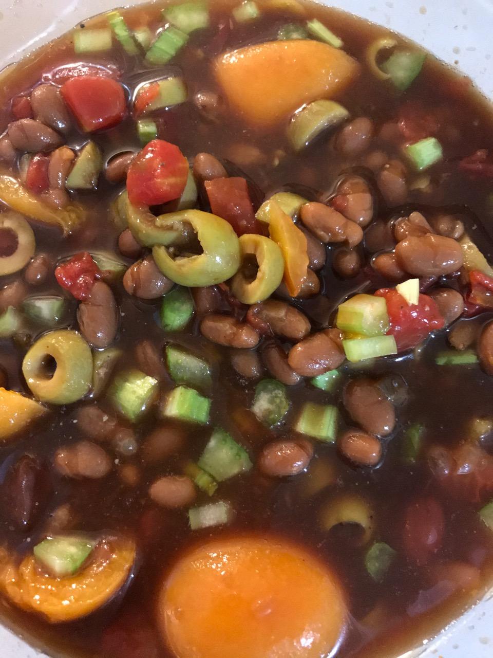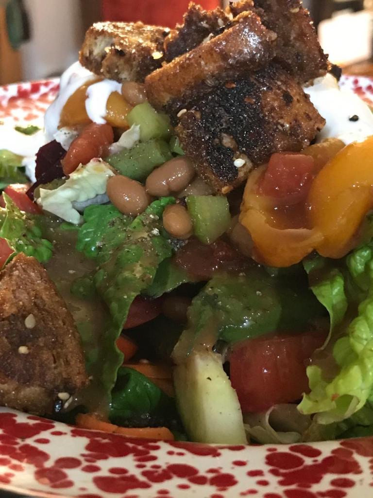 Now if you want to be extravagant spoon APRICOT BARBECUE BEAN SALAD over a green garden salad. Top with CANDIED EVERYTHING CROUTONS and DAIYA BLEU CHEESE DRESSING dairy-free of course!