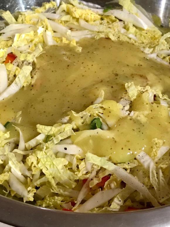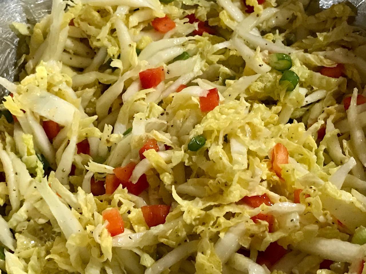 In large bowl place cabbage, scallion and red pepper. Toss to evenly distribute.