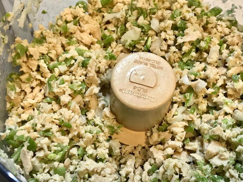 Place soy chicken, onion and string beans in food processor. Pulse till evenly chopped but not mush.