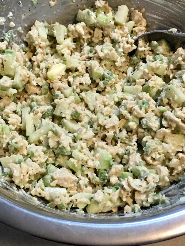 Most of us wouldn’t think of putting fresh green beans in a chicken salad, but it works. PLANT CHICKEN OF COURSE! High fiber and a nice crunch with tiny cuts. Give it a try, see what you think! We reduce the fat by using Poupon Dijon mustard in addition to the veg mayo!